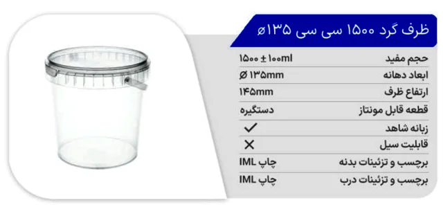 سطل گرد 1500 سی سی دسته دار پولاد پویش، ساخته شده از مواد با کیفیت، دارای دسته مقاوم برای حمل آسان، طراحی کاربردی و ظرفیت مناسب برای استفاده روزمره در محیطهای مختلف مانند آشپزخانه و محل کار. دوام بالا و ظاهری ساده و شیک.