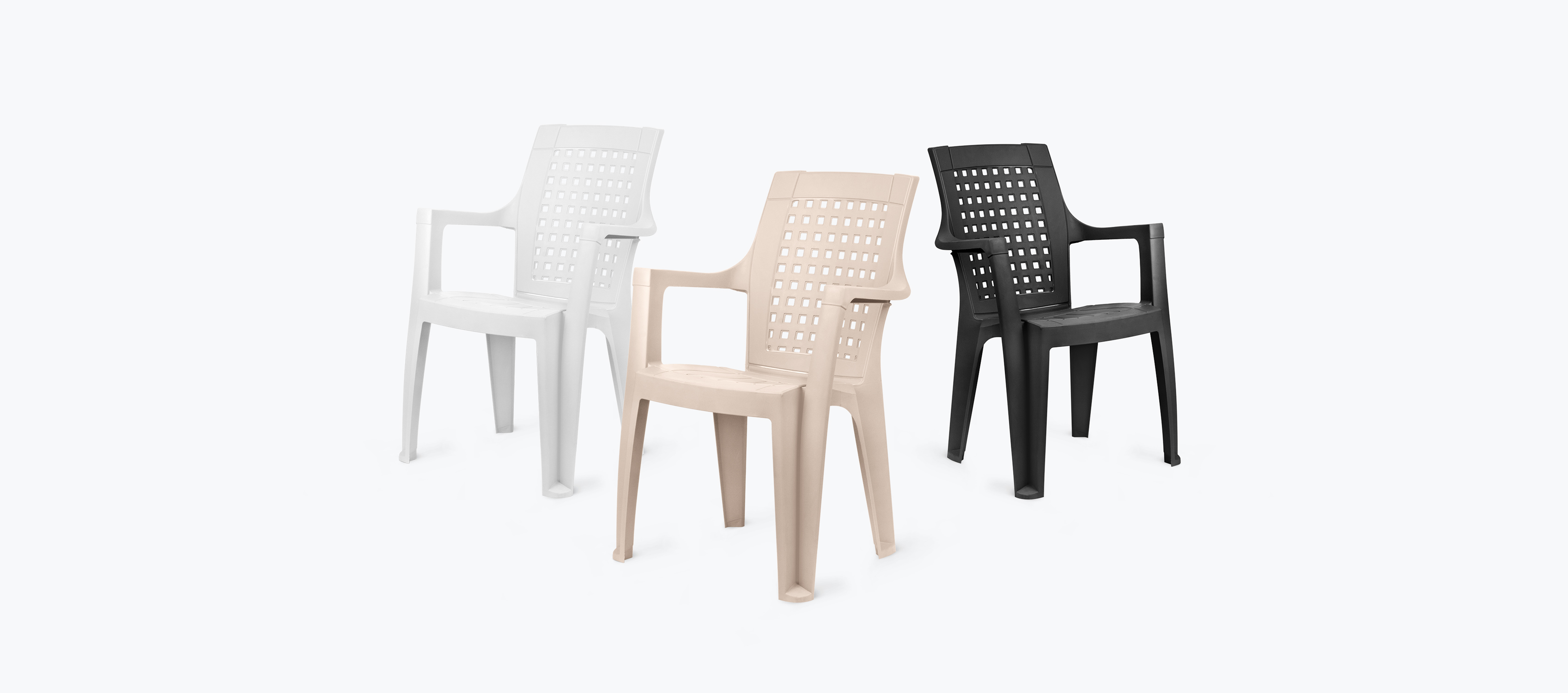 صندلی دسته دار پلیمری یک تکه از جنس پلی پروپیلن تقویت شده با مواد معدنی؛ در سه طرح پشتی متفاوت؛ سطح ظاهری با جلوه مات؛ رعایت اصول ارگونومی؛ قابل ارائه در ۹ رنگ؛ مقاوم در برابر اشعه ماوراء بنفش، نشیمن عمیق و تکیه گاه بلند.
