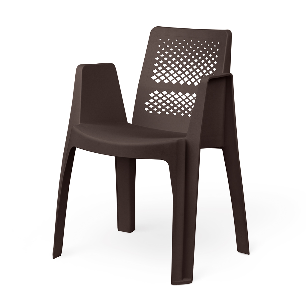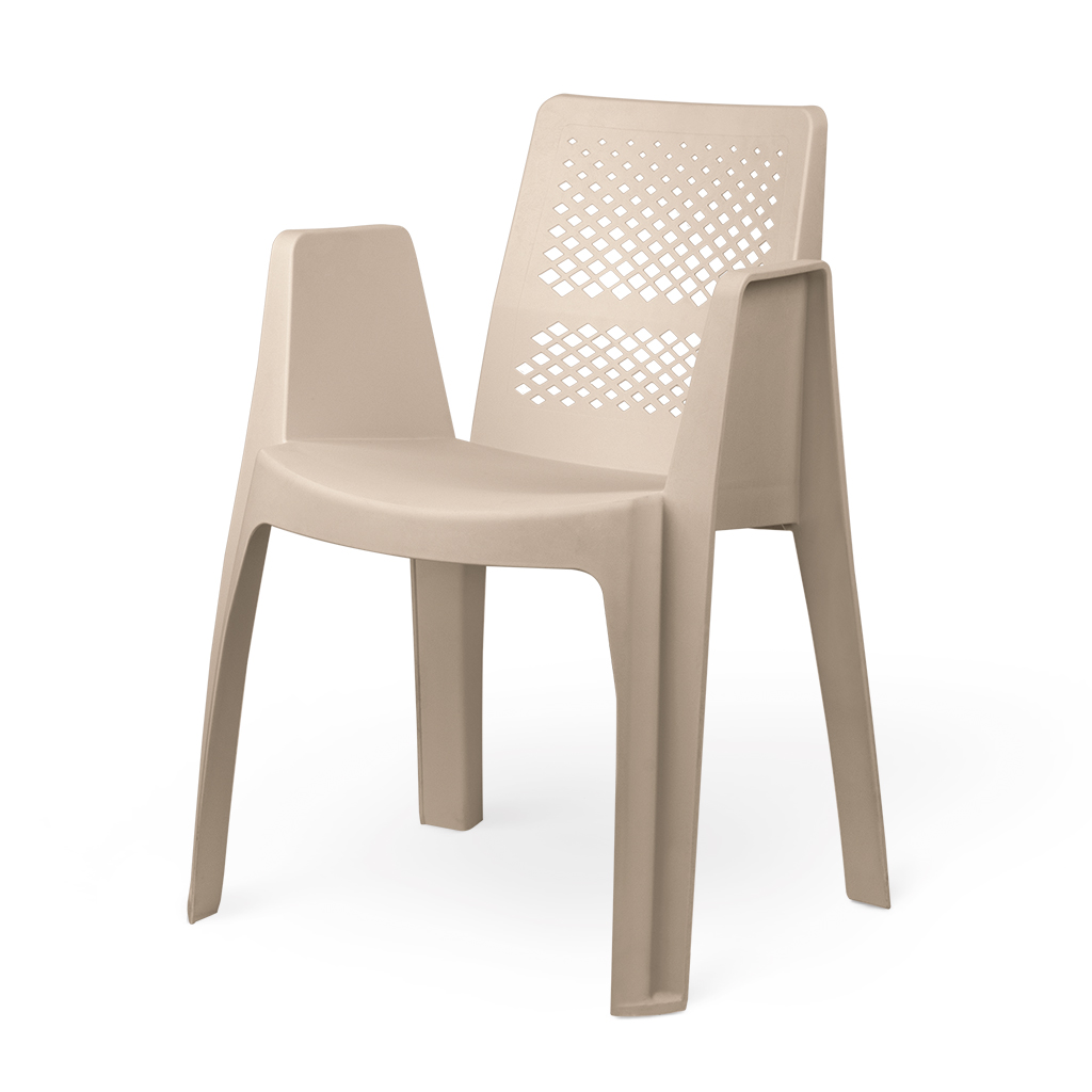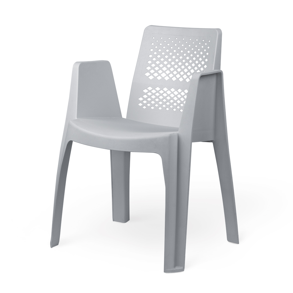 صندلی دسته دار پلیمری یک تکه از جنس پلی پروپیلن تقویت شده با مواد معدنی؛ در دو طرح پشتی متفاوت؛ سطح ظاهری با جلوه مات؛ رعایت اصول ارگونومی؛ قابل ارائه در ۹ رنگ؛ مقاوم در برابر اشعه ماوراء بنفش، نشیمن عمیق و تکیه گاه بلند.