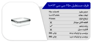 ظرف مستطیل پولاد پویش شفاف 250 سی سی، ظرفی با طراحی مستطیل و حجم 250 سی سی است که از جنس مواد با کیفیت تولید شده و شفافیت بالایی دارد. مناسب برای بستهبندی و نگهداری انواع مواد غذایی به صورت بهداشتی و ایمن میباشد.